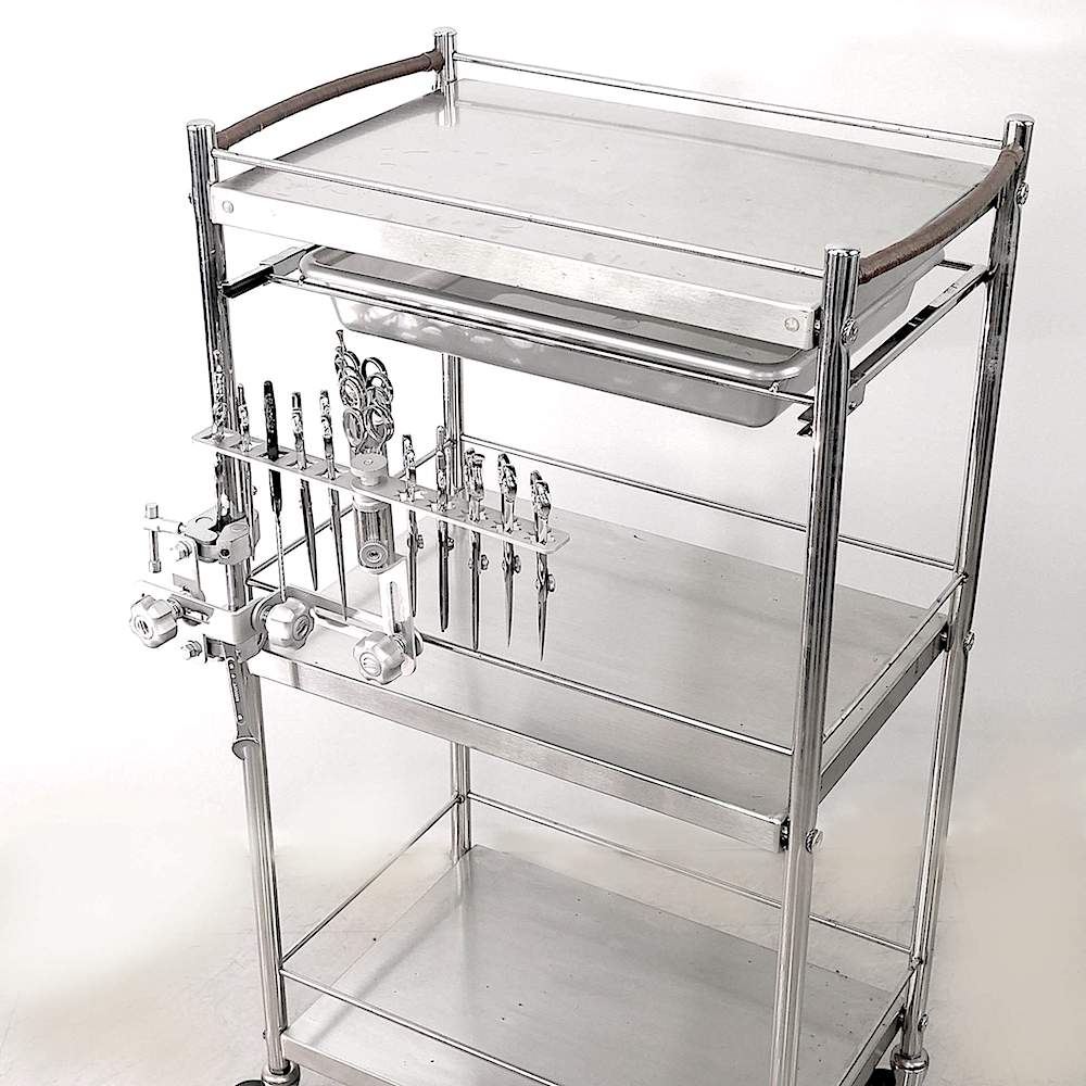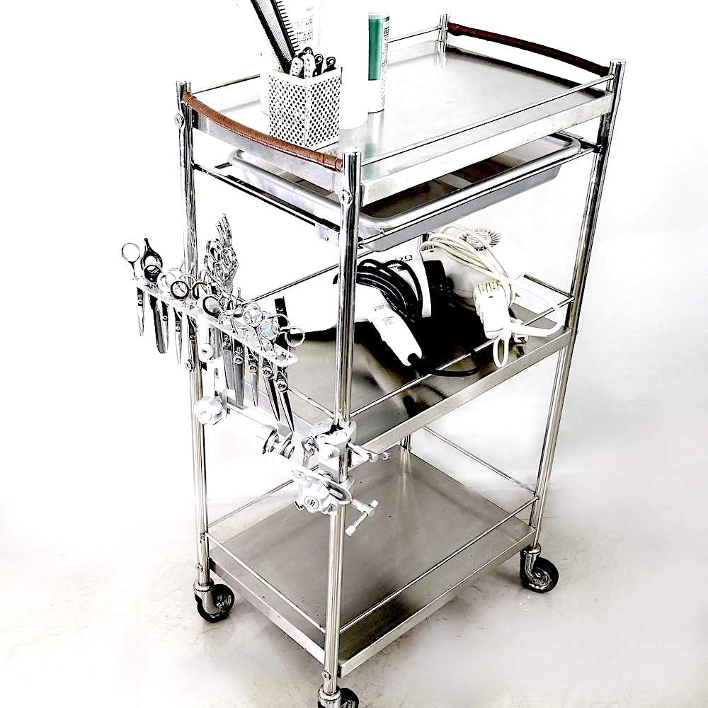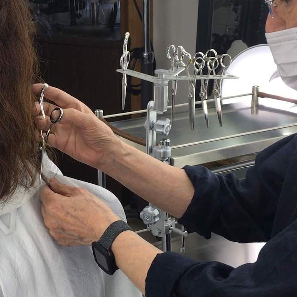サロン内の理美容ワゴンやキャスター付きスタンドなどどこにでも取付取外し自在。愛用シザーはいつも技術者と共に未来を創る。