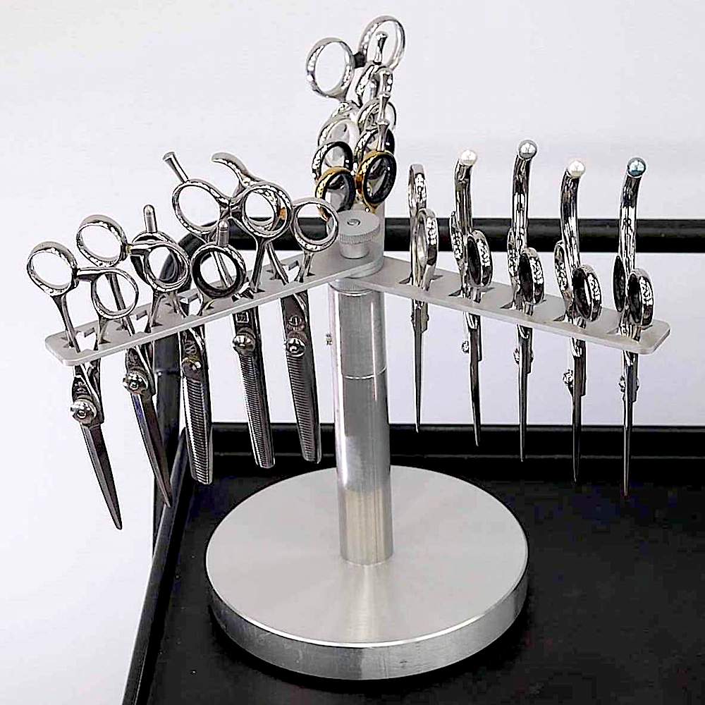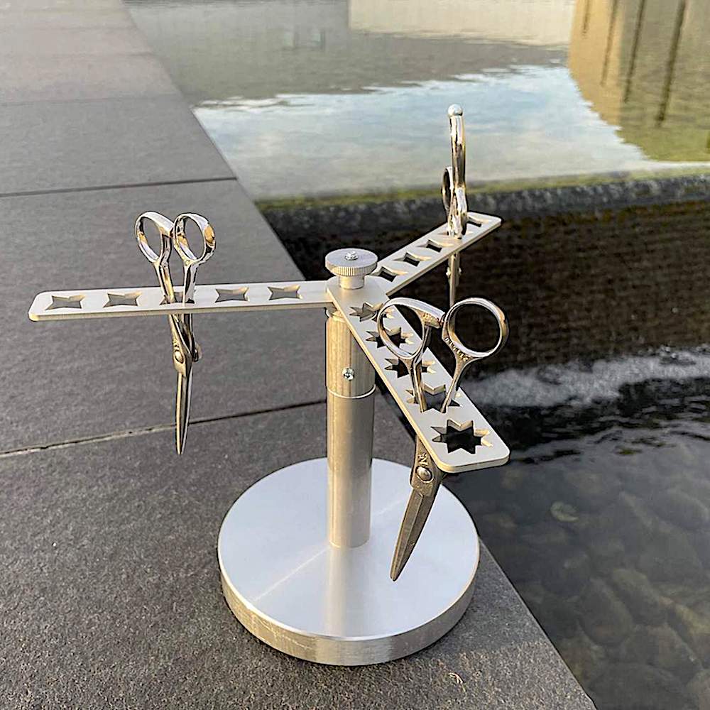 シザーケース革命-卓上スタンド式を美容師と町工場がタッグを組み製品化。再生可能な高品質のアルミ合金製。町工場の切削精密加工による重厚感ある台座 ブレない直立収納で愛用シザーの存在感と清潔シザーをアピールします。【シザーメーカーにオススメ】シザー15町が余裕で収納できます。オプションでシザー25丁収納